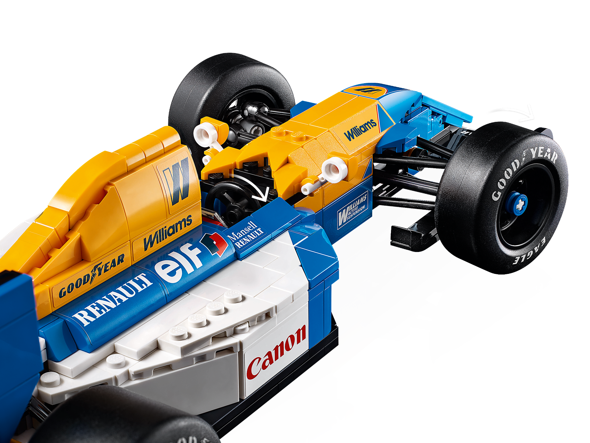 Details und Funktionen: Der LEGO® Icons Williams RacingFW14B F1® Rennwagen verfügt über eine funktionierende Lenkung, breite Slicks mit dem Aufdruck Goodyear auf den Hinterrädern und einen detaillierten Motor