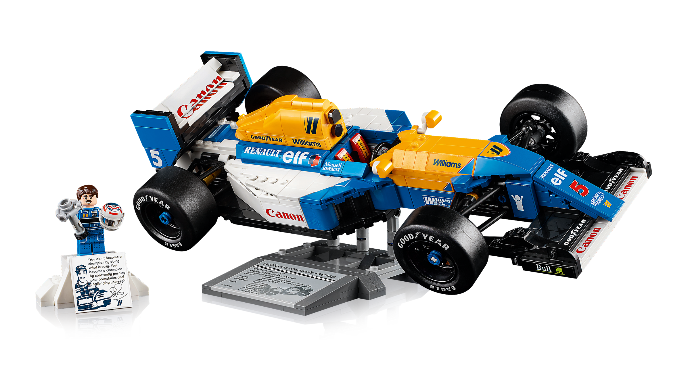 Hingucker für den Schreibtisch: Auf dem Ständer für den Williams Racing FW14B sind Statistiken des Fahrzeugs aufgedruckt. Der Ständer für die Minifigur ist einem Siegerpodest nachempfunden und trägt ein Foto und ein Zitat von Nigel Mansell