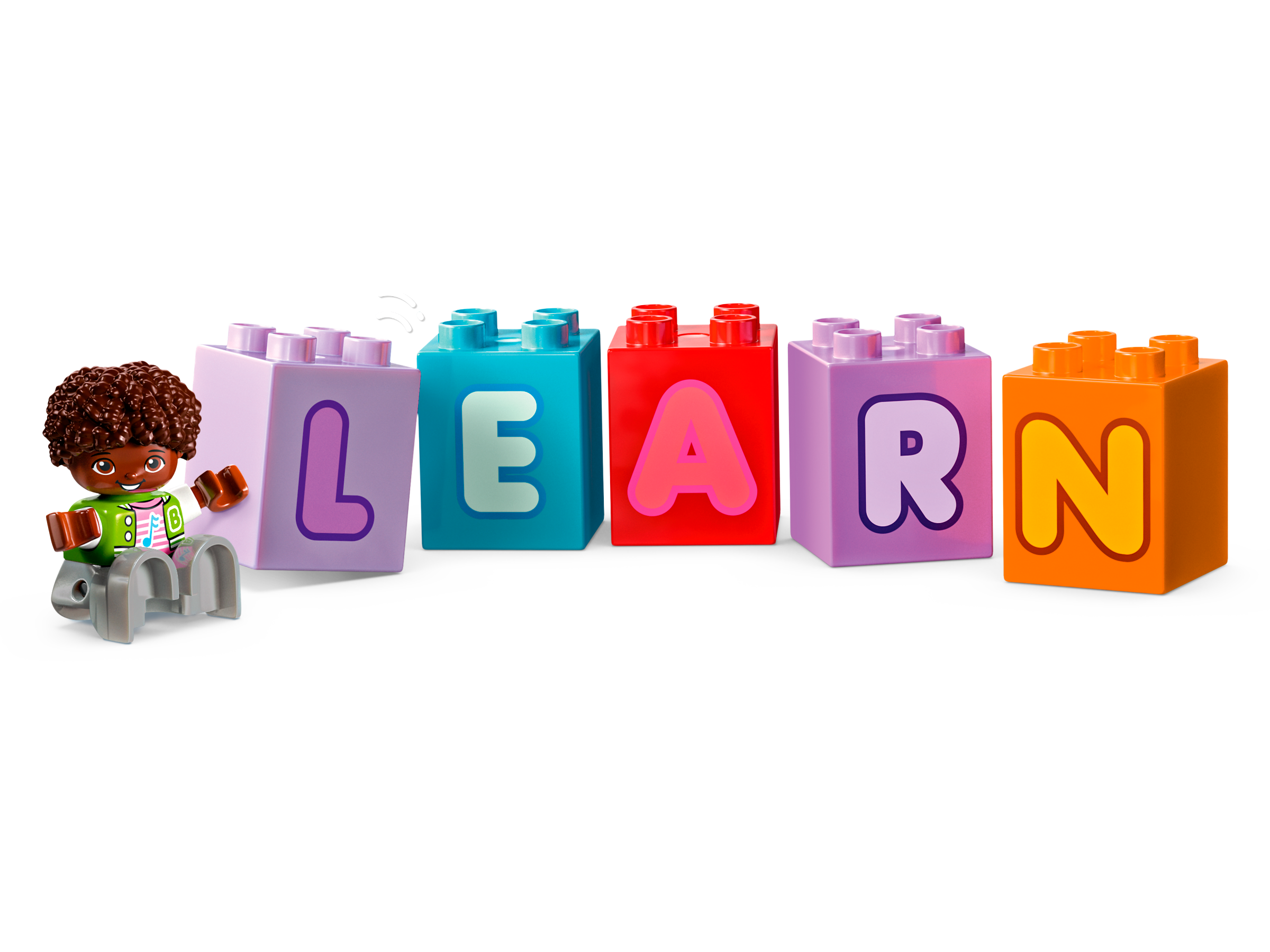 Fantasievolles Zubehör: Eine LEGO® DUPLO® Spielzeug-Stereoanlage ermutigt Vorschulkinder dazu, das ABC zu singen. Und ein Buch bringt Kleinkinder auf die Idee, die Buchstaben vorzulesen