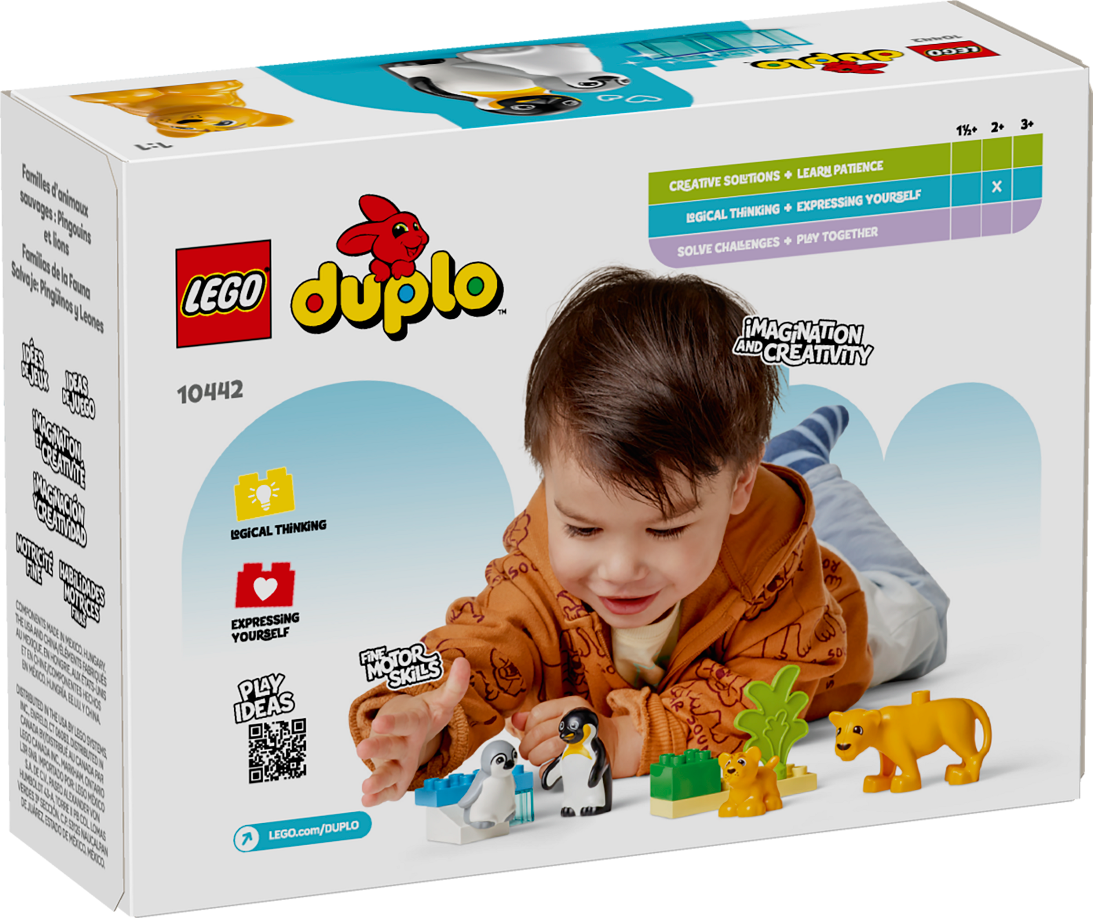 Geh mit Kleinkindern ab 2 Jahren auf eine lustige Lernreise von der Antarktis nach Afrika. Wildtier-Familien: Pinguine und Löwen (10442) ist ein fantasievolles Bau- und Spielset mit 2 LEGO® DUPLO® Pinguinen und 2 Spielzeuglöwen, die Kleinkinder viele Stunden kreativ spielen lassen.