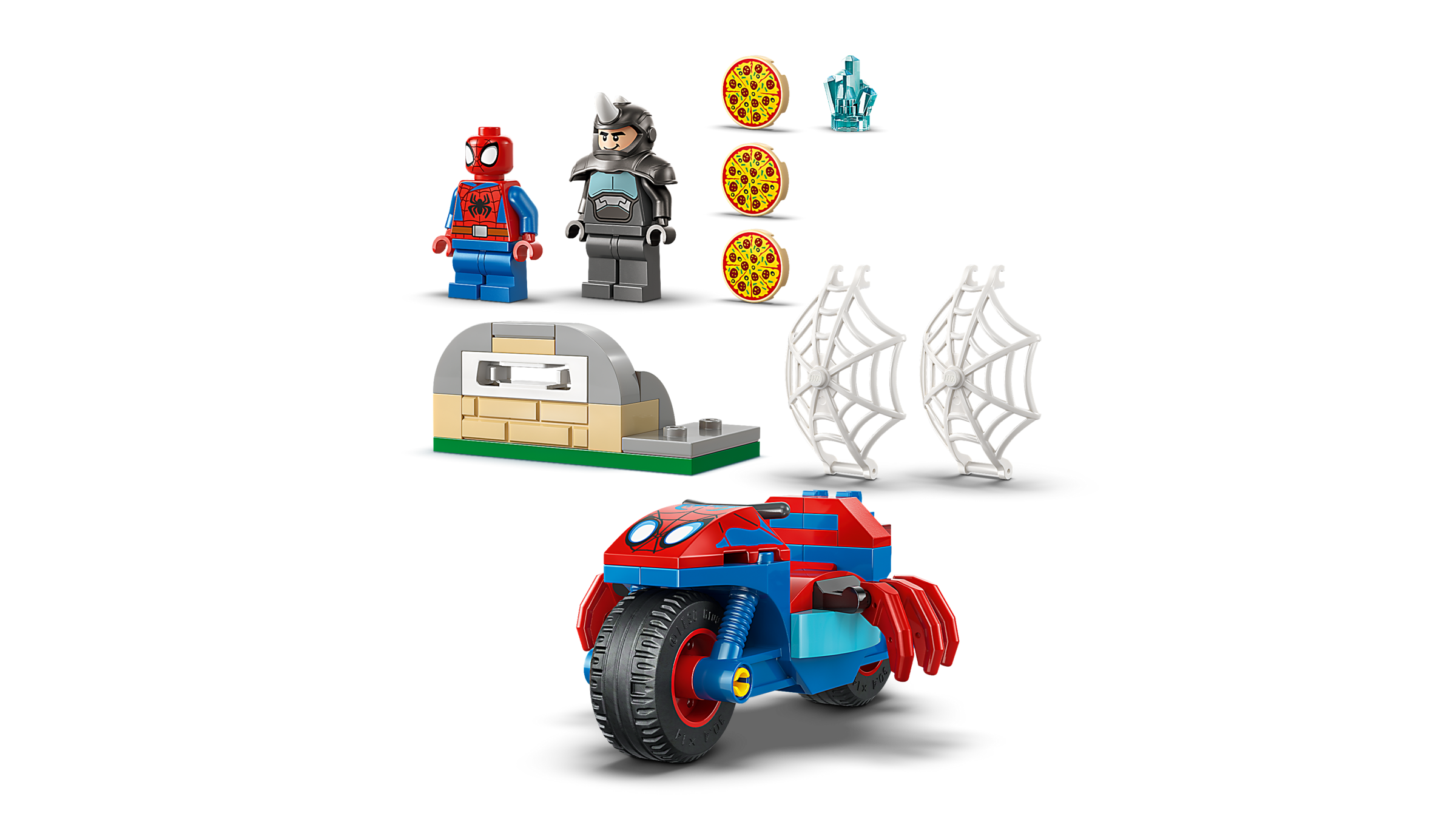 MARVEL-ACTION MIT SPIDEYS MOTORRAD: Die Kinder helfen Spidey, einen gestohlenen blauen Edelstein zurückzuholen, weichen Pizza aus, die Rhino mit seinem Pizzaofen-Shooter auf sie schleudert, und fangen Rhino in einem riesigen Spinnennetz