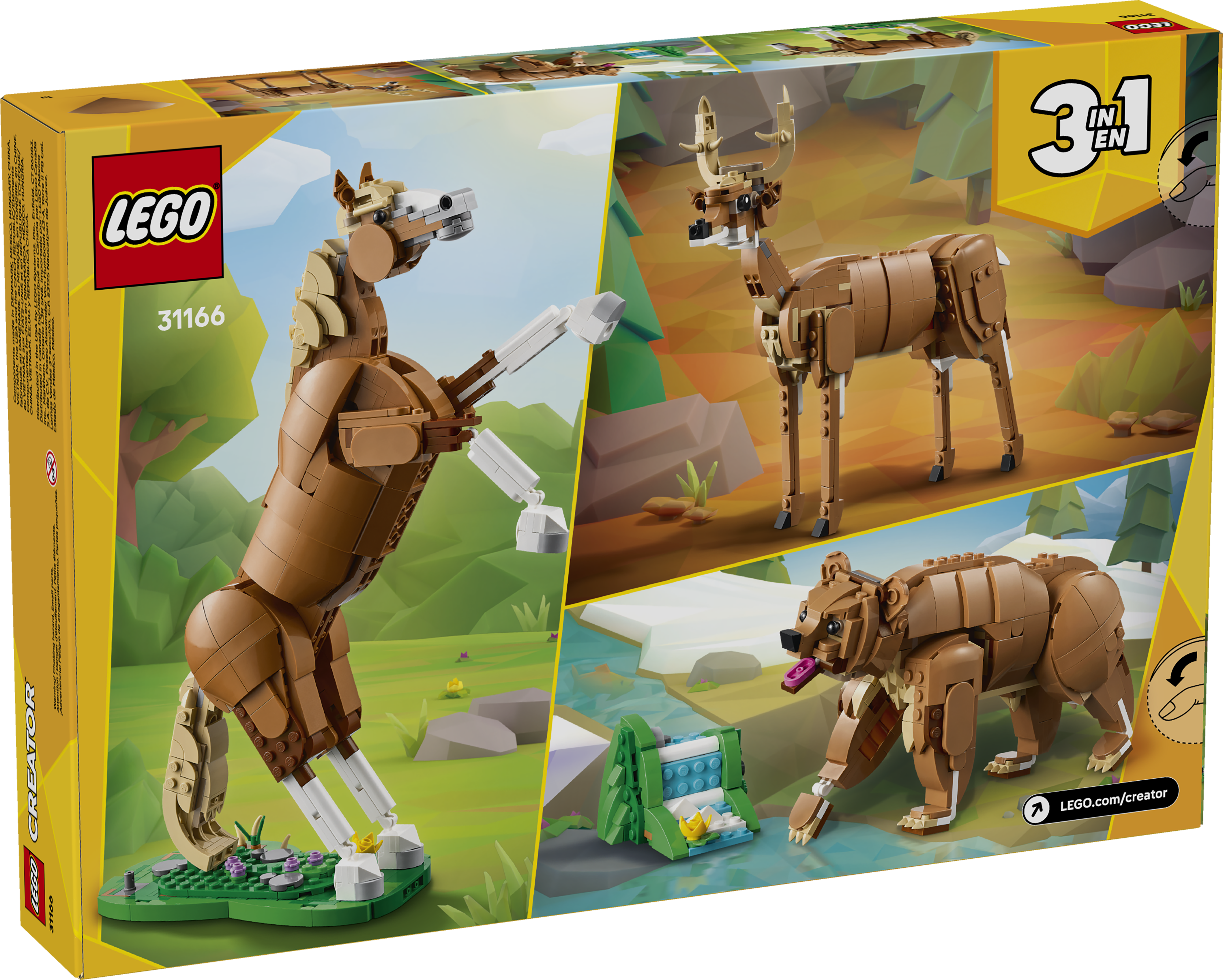 Kinder können aus denselben Steinen 3 verschiedene Modelle bauen: ein LEGO® Spielzeugpferd, einen Braunbären an einem kleinen Wasserfall oder einen anmutigen Hirsch. Alle 3 Tierfiguren sind beweglich und machen dieses vielseitige Spielset zu einem kreativen Geschenk für Kinder.