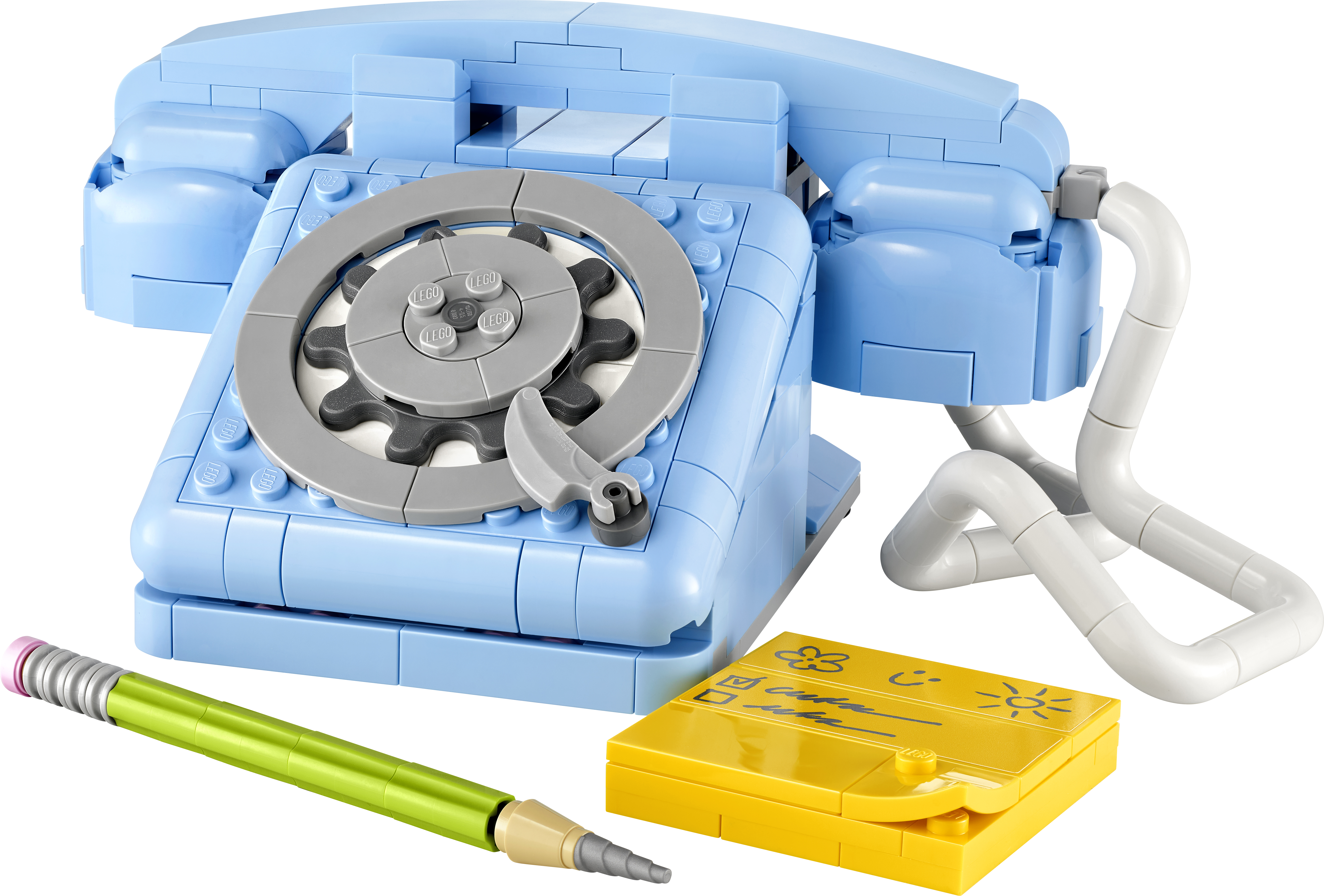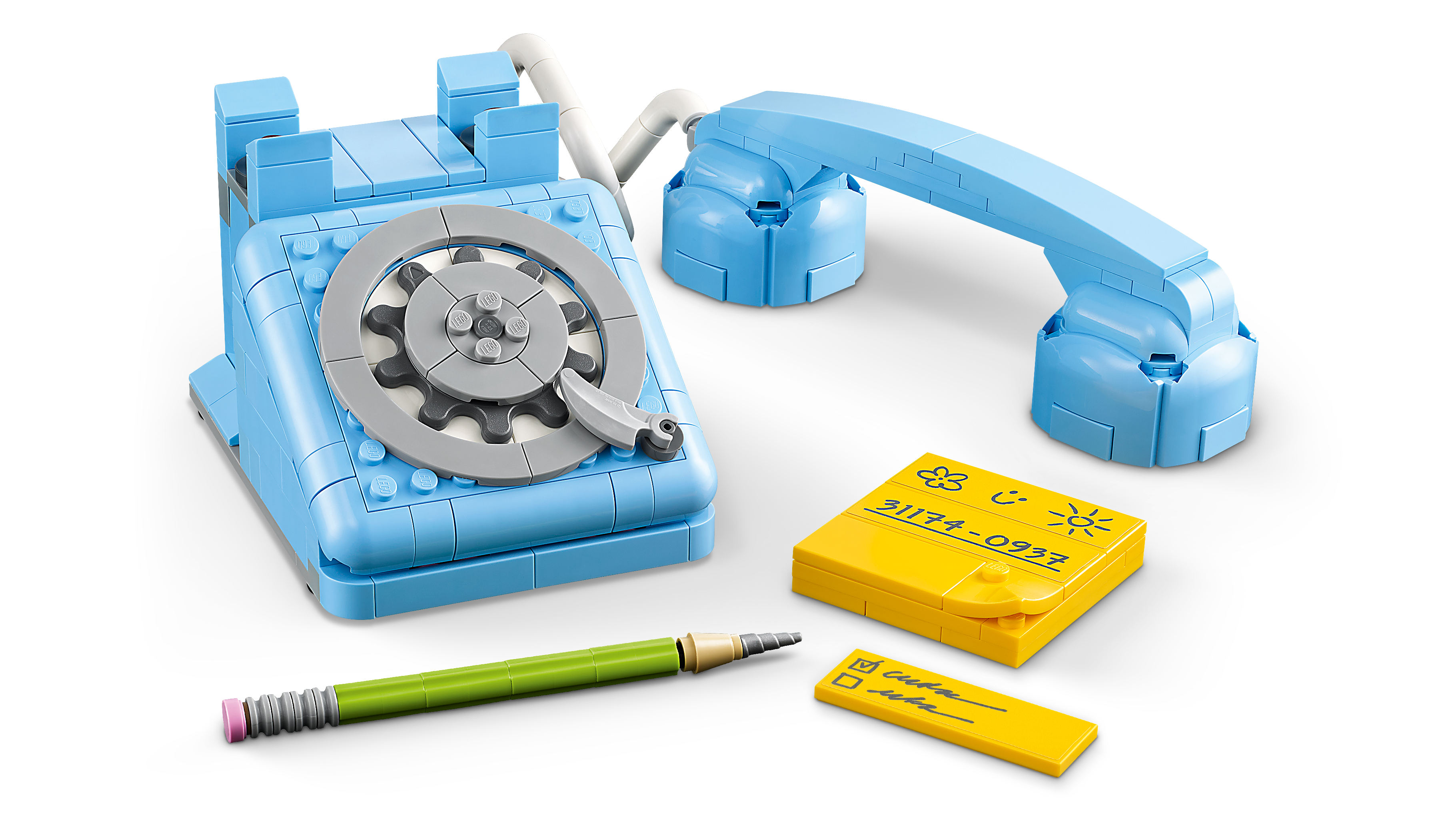 • Viele Funktionen: Das Telefon aus den 1960ern hat einen abnehmbaren Hörer, eine Wählscheibe und eine Federfunktion, wenn der Anrufer auflegt. Ein Bleistift aus LEGO Steinen und ein Haftnotizblock vervollständigen das Modell