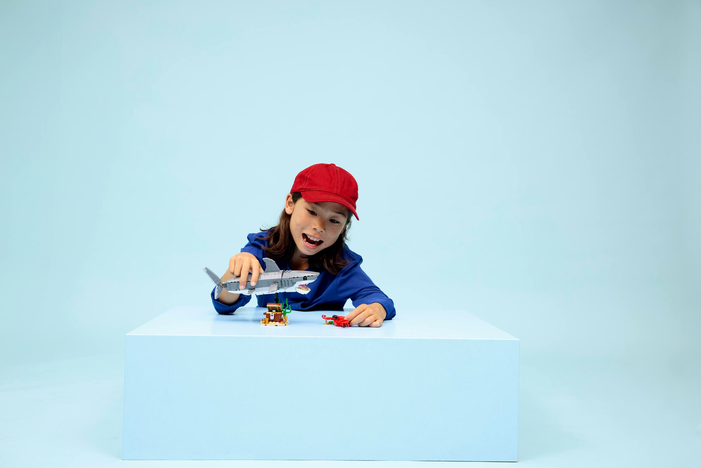 Kinder können zunächst einen beweglichen Spielzeughai bauen und ihn dann auf einem Ständer zusammen mit einer Schatztruhe und einer Krabbe ausstellen. Das Modell kann man in einen Seeteufel auf einem Ständer mit Meerespflanzen oder in einen Mantarochen auf einem Ständer mit Muschelschale umbauen. Nach all dem Bau- und Spielspaß kann eines dieser Modelle als Zimmerdeko ein Regal oder den Schreibtisch schmücken.
