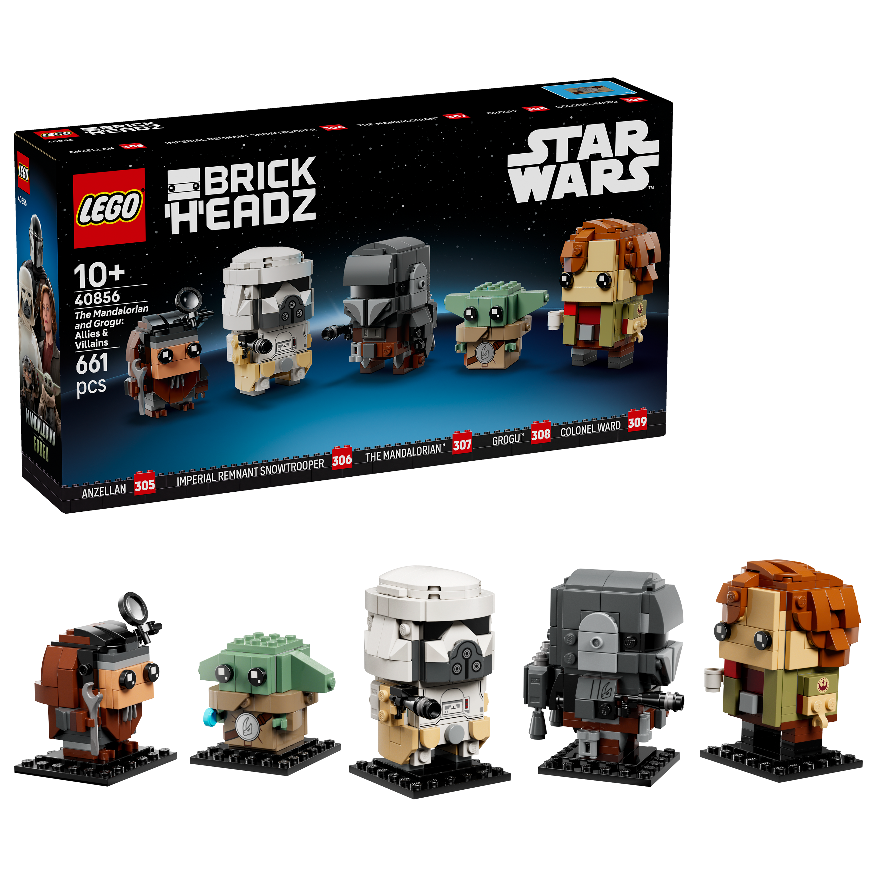 The Mandalorian and Grogu: Verbündete und Bösewichte (40856) ist ein Set zum Bauen und Ausstellen, das die coolen Figuren in bester LEGO® BrickHeadz™ Art darstellt. Dieses tolle spontane Geschenk zu jedem Anlass besteht neben vertrautem Zubehör aus den LEGO Figuren Grogu, Colonel Ward, einem Schneetruppler des Restimperiums, einem Anzellaner und dem Mandalorianer, die du aus Star Wars: The Mandalorian and Grogu kennst. Baue unter anderem Mando und Grogu in ihrer Rüstung aus Beskarstahl und den Anzellaner in seinem Outfit als Droidenschmied, um eine spektakuläre Star Wars™ Zimmerdeko zu erschaffen. Das Set besteht aus 661 Teilen.