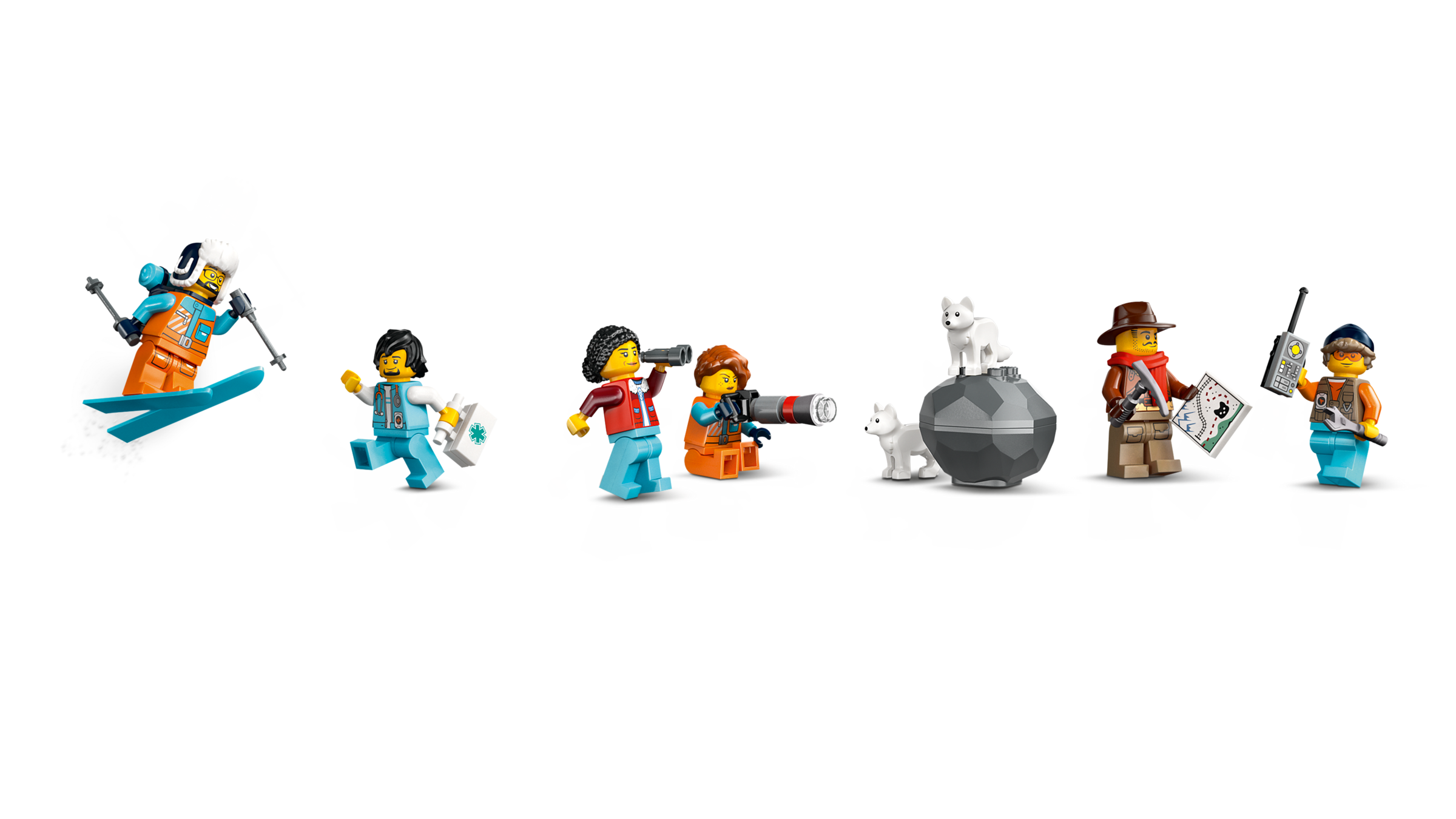 Details und Funktionen: Kinder können den Spielzeugzug durch den Bergtunnel fahren lassen, um eine Felssturz-Funktionzu aktivieren, und Minifiguren an einer Seilrutsche vom Berg zum Arktisaußenposten schicken