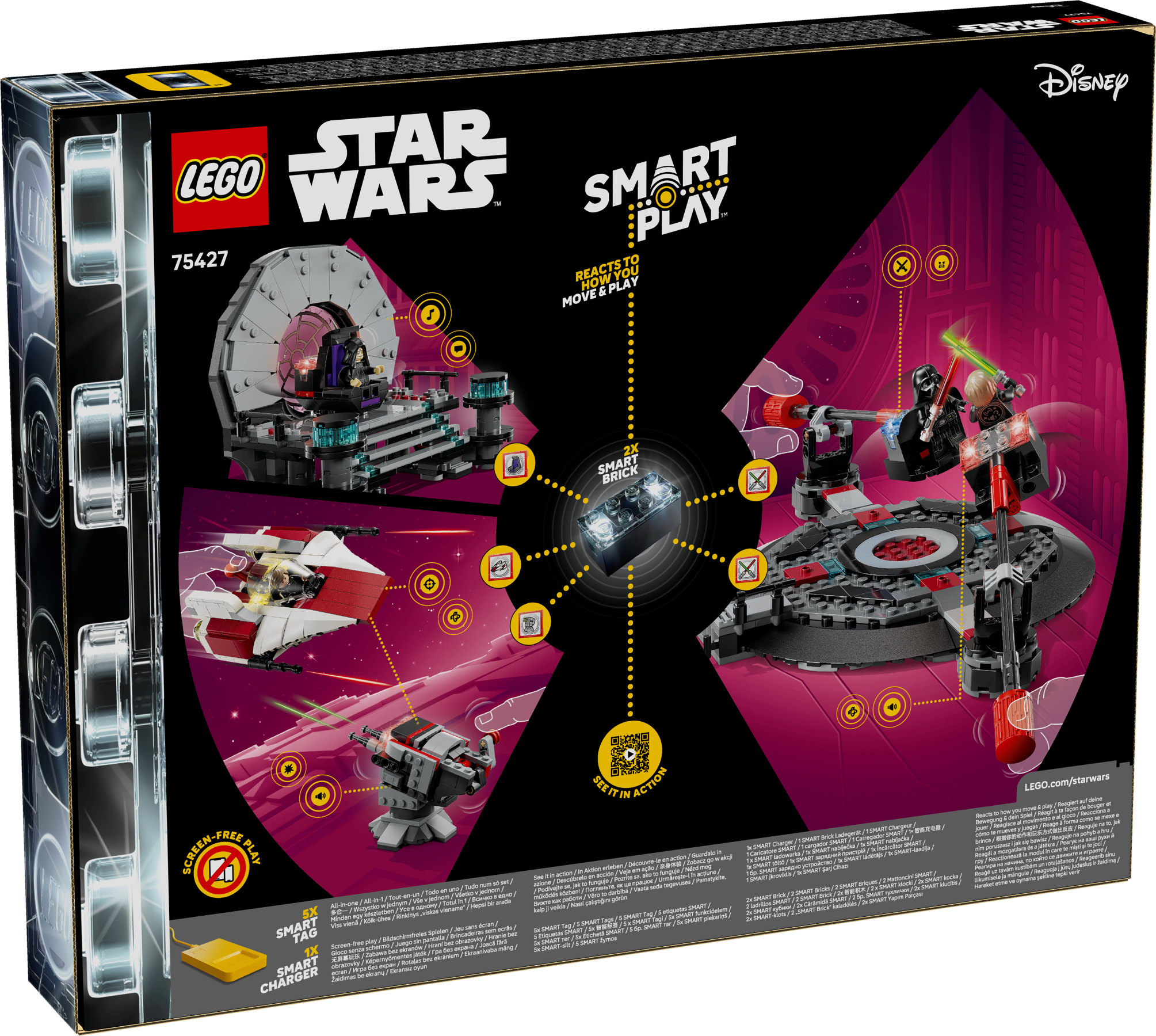 Dieses LEGO® Star Wars™ Set (75427) lässt Kinder ein aufregendes Duell im Thronsaal und den Angriff eines A-Wings auf den Todesstern nachspielen. Dieses All-in-1-Set mit dem LEGO SMART Play™ System beinhaltet alle SMART Play Elemente. 2 SMART Bricks und ein SMART Brick Ladegerät, 3 LEGO SMART Minifiguren und 5 SMART Tags machen das Abenteuer mit authentischen Sound- und Lichteffekten noch realistischer.
