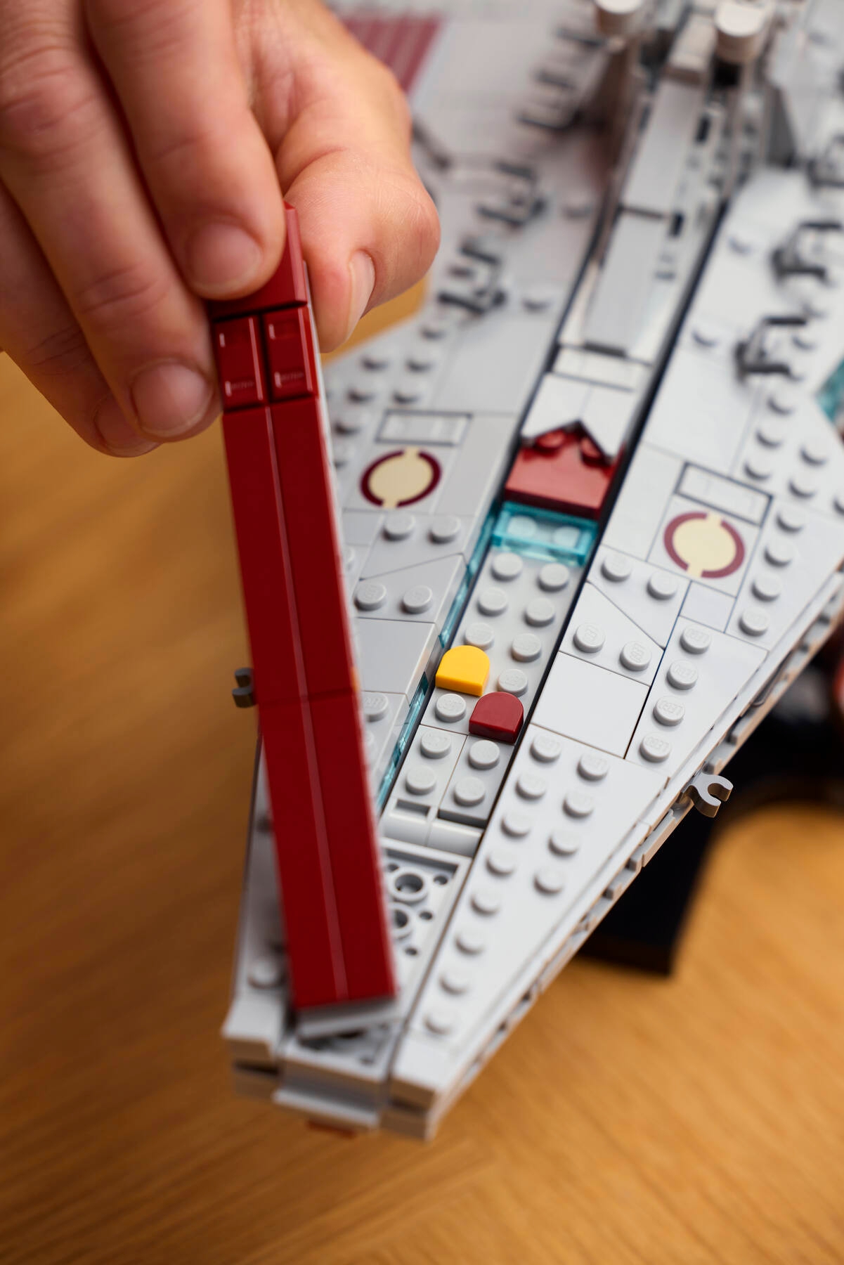 AUTHENTISCHE DETAILS: Bilde die stromlinienförmige Silhouette und die markanten Erkennungszeichen des legendären Angriffskreuzers der Venator-Klasse mit LEGO® Steinen nach