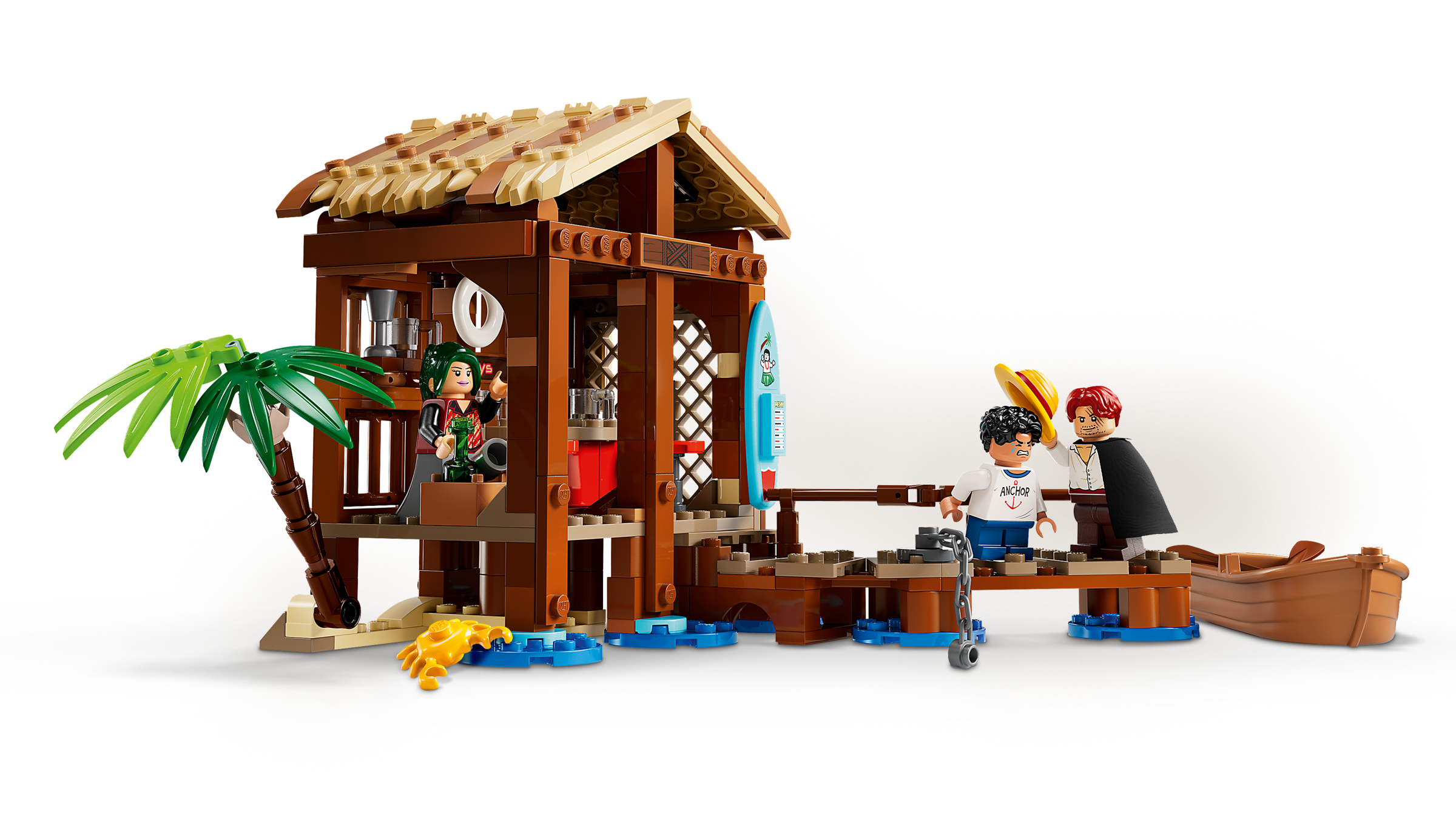 Kinder können das Dach der Strandbar abnehmen, um die detailreiche Einrichtung zu bestaunen und im Innenraum zu spielen. Drinnen finden sie Zubehör für den Betrieb der Bar und zur Unterhaltung der Gäste. An der Wand lässt sich nicht nur ein Steckbrief befestigen, sie bietet auch Platz für weitere Steckbriefe aus anderen separat erhältlichen LEGO® ONE PIECE Sets. Außerhalb der Hütte ist ein Piratenboot mit einem Seil am Steg angebunden. Das Set beinhaltet auch die Minifiguren Ruffy, Shanks und Makino, 3 unvergessliche Charaktere aus der Netflix-Serie. Zusätzlichen Bauspaß bietet die intuitive LEGO Builder App. In der App können Baumeisterinnen und Baumeister 3D-Ansichten der Modelle vergrößern und drehen und ihren Baufortschritt verfolgen. Das Set besteht aus 299 Teilen.