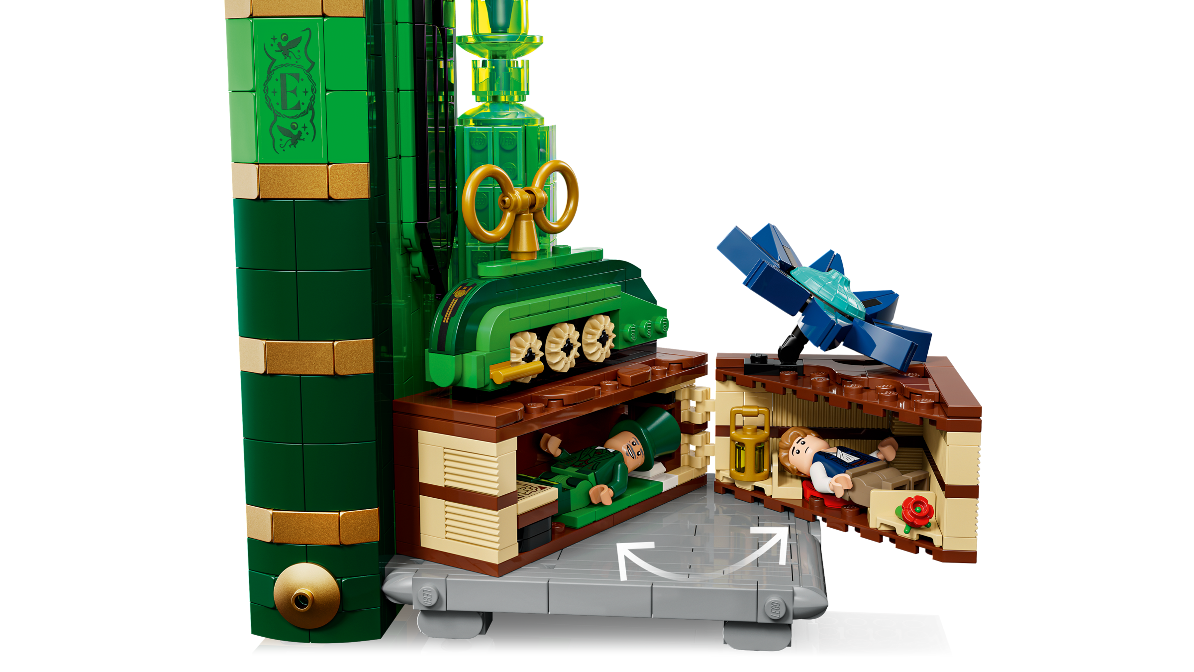 Elphabas grüne Bücherstütze beinhaltet ihre grüne Elixierflasche, ein Modell von Emerald City und ein Gehäuse für das Grimmerie mit Geheimfächern für die beiden Minifiguren: The Wizard und Fiyero. In Glindas rosafarbener LEGO Bücherstütze befindet sich ein Modell der Universität Shiz. Ein Schmetterling sitzt auf einem Bücherstapel mit einem Fach für die Minifiguren Madame Morrible und Pfannee.