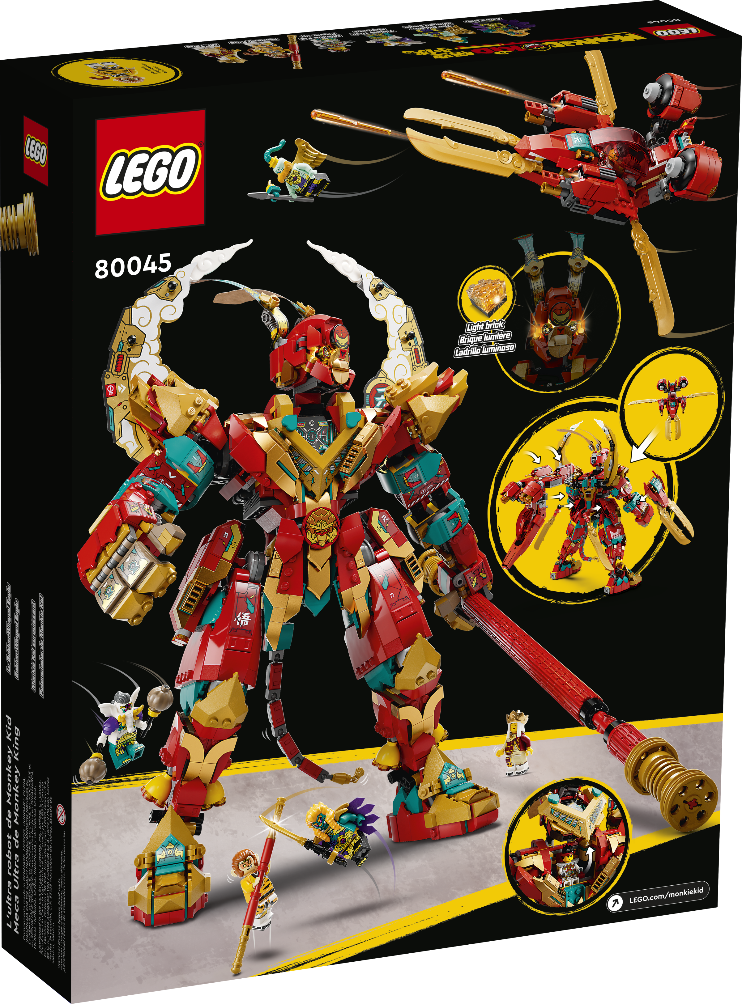 LEGO® Monkie Kid™: Monkey Kings Ultra-Mech (80045) begeistert Kinder ab 10 Jahren für klassische Sagen. Das Modell ist an den früheren Monkey King Mech angelehnt und wurde mit neuen Details und Funktionen aufgepeppt, die noch mehr Spielspaß bieten. Hierzu zählen auch die Boosterraketen am Rücken, die neu gestaltete Rüstung, die mit einem Lichtstein dargestellte neue Kraft des Goldblicks, ein Stab und weiteres Zubehör, das sich in einen Jet verwandeln lässt.